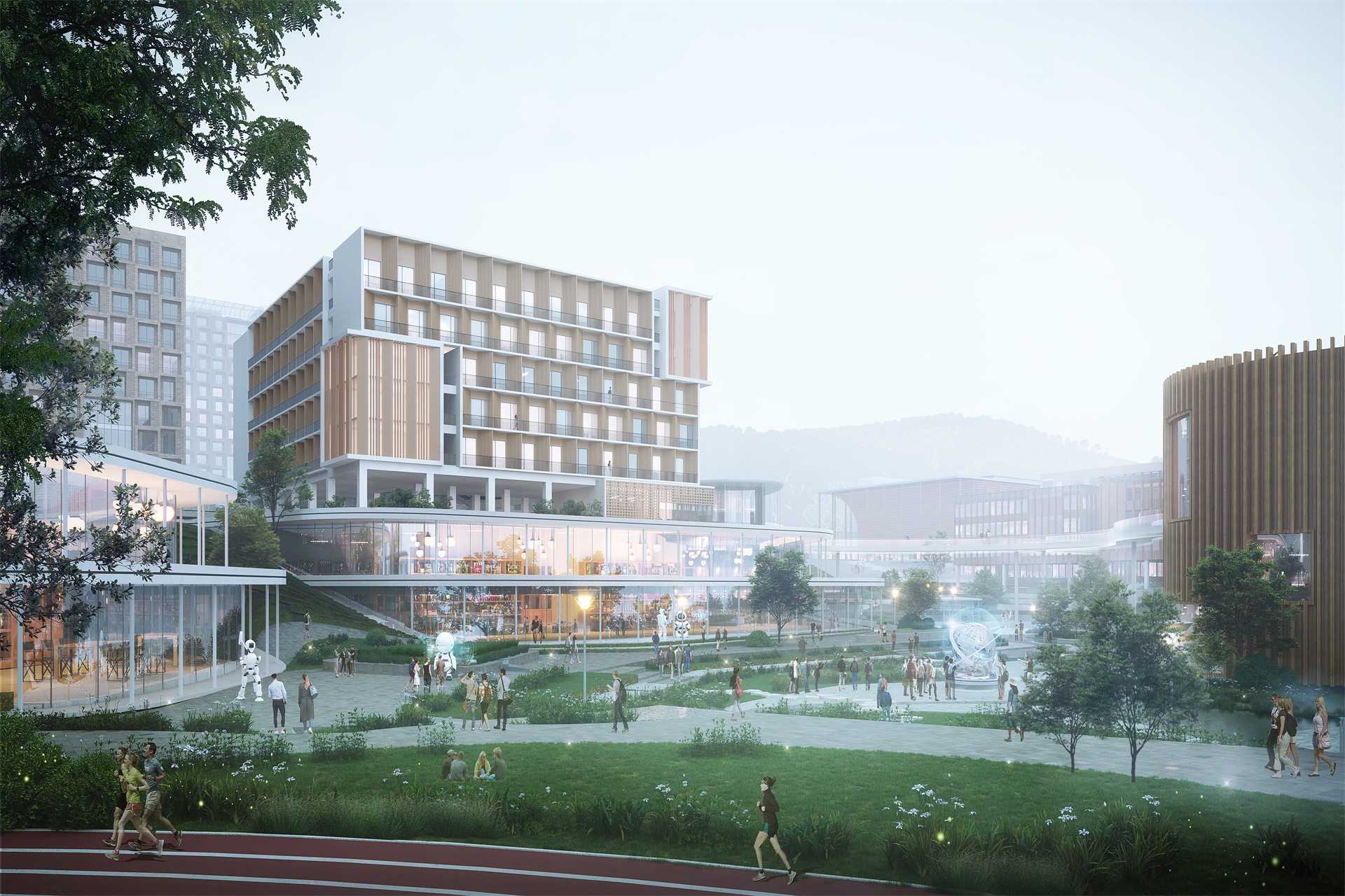 西部(重庆)科学城含谷学校国际竞赛入围计划,设计希望创立一种全新的、在自然中教学的场景。通过独具特色的自然户外学习空间,给学生气会学习新的要领,在教育中立异和试验。校园将成为一个学习实验室,来探索获取知识和探讨自我的新要领。绿轴作为校园的中心,学生和先生在多样的空间中运动、社交、学习和思索。绿轴的差别区域通过水系、桥梁和廊道毗连起来,形成一个可扩展的交流网络。绿轴是主要的情形纽带,将山体植被和水系延伸到学校的中心地带,缓解都会热岛效应,为周围的动物创立新的栖息地,并为学生探索自然提供更多的舞台。