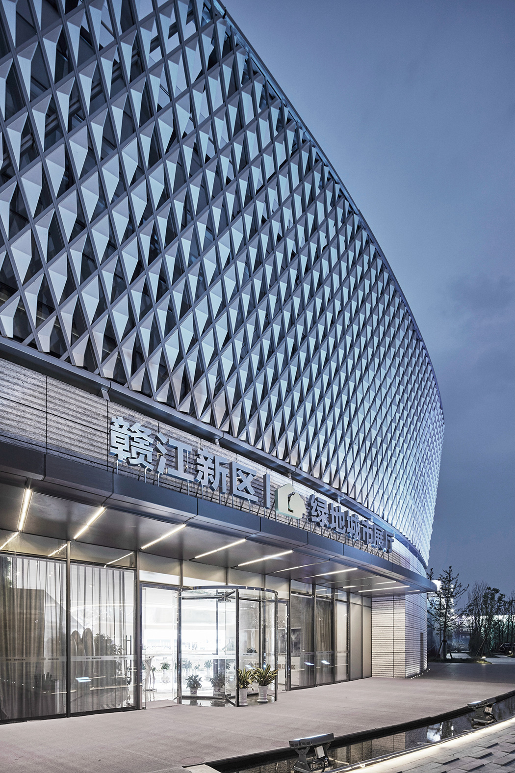 南昌赣江新区绿地都会展厅作为新区的首开之作,整体妄想植入了时间的看法,在时间轴中寓意展望未来。设计提取了船的造型,以双方弧线为界线,修建出船头形象,乘风破浪,面水而行。工程设计亮点是修建外围护接纳了双层幕墙系统,内层为深色玻璃幕墙作为图底,外层为银白色斜向铝板,上大下小同心同曲率设计,塑造出来强烈的视觉攻击力。模数化银白色铝板通过氟碳喷涂钢管网架支持,组成千帆众影的外立面承重网架接纳钢架、 铝方管,其形态与外立面网架吻合内侧幕墙外挑毗连件与网架铝方管毗连。